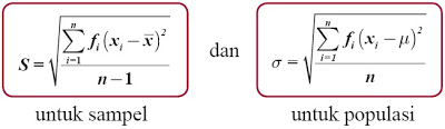Sekumpulan data kuantitatif yang dikelompokkan, dapat dinyatakan oleh x1, x2, …, xn dan masing-masing data mempunyai frekuensi f1, f2, …, fn. Simpangan baku (S) dari data tersebut diperoleh dengan menggunakan rumus :